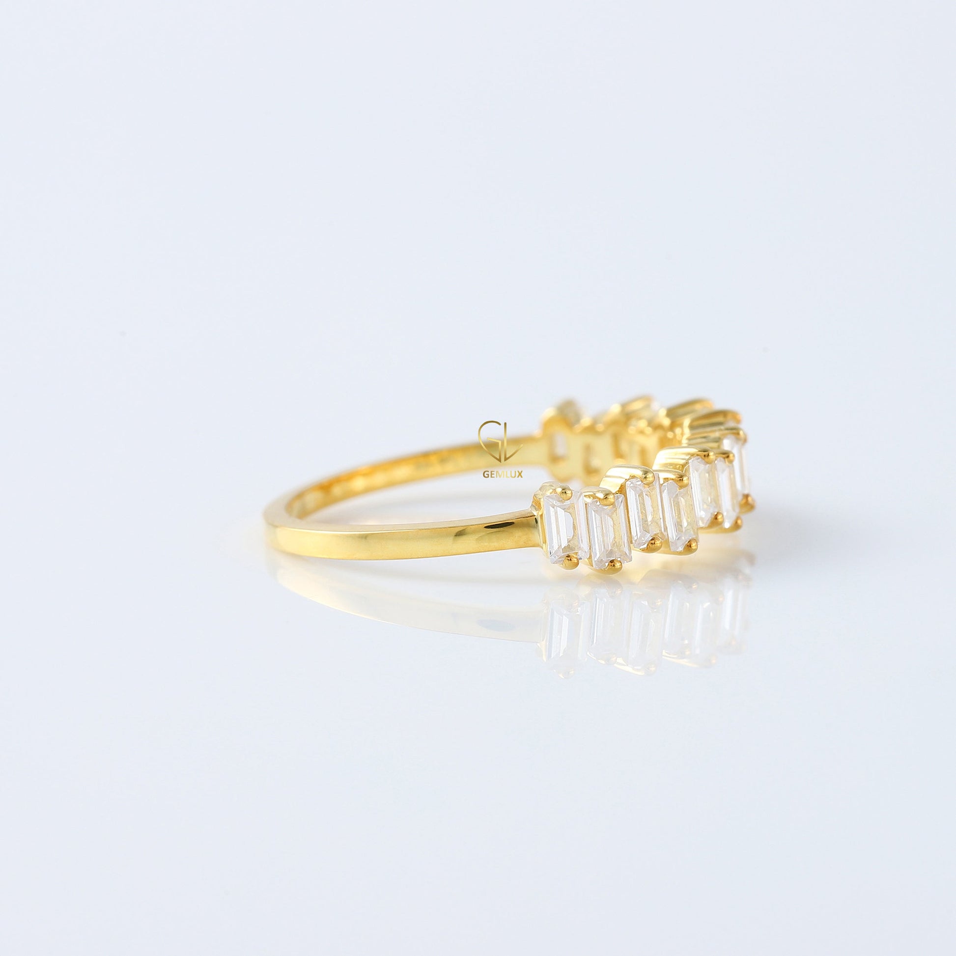 Elegant Baguette Cut Lab Grown Half Eternity Wedding Band, crafted in yellow gold with a stunning zig-zag baguette design. EGL certified and eco-friendly, this stackable ring is perfect for weddings, anniversaries, or everyday luxury. Timeless style meets sustainable sparkle — conflict-free and made to last.